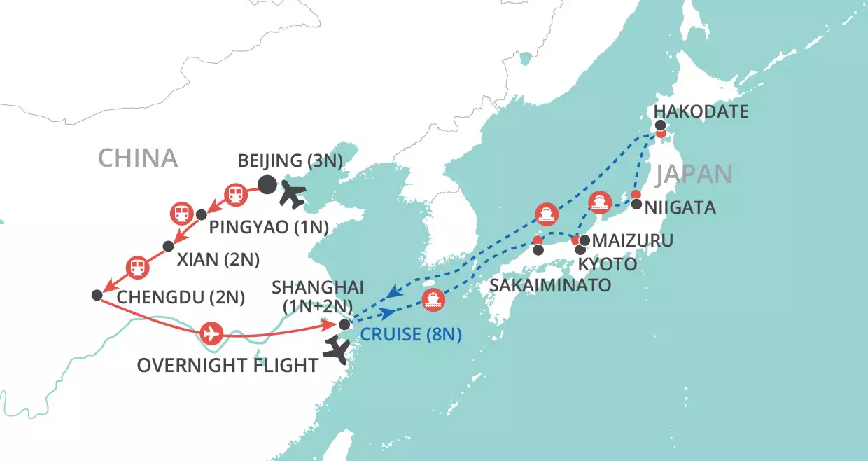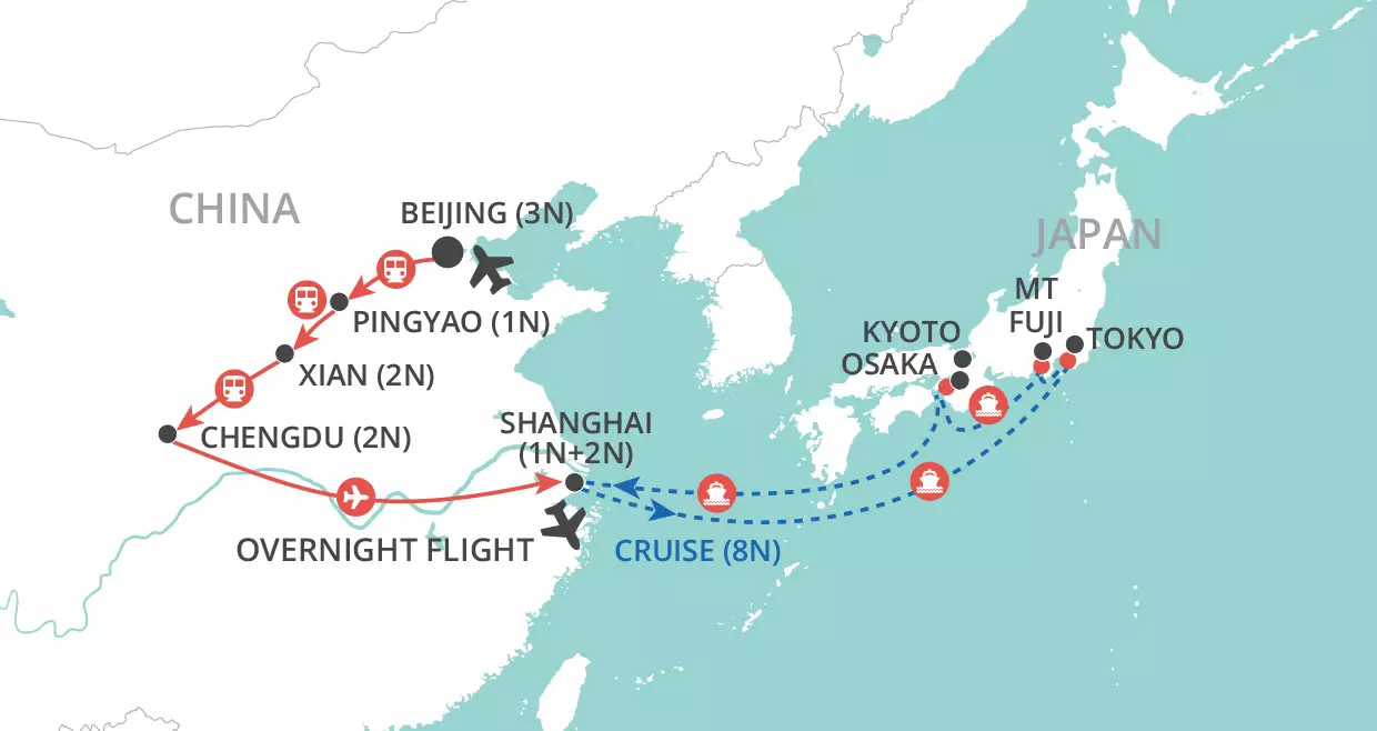 Beijing (3N) – Pingyao (1N) – Xian (2N) – Chengdu (2N) – Shanghai (1N) – Royal Caribbean Cruise (8N) – Shanghai (2N)